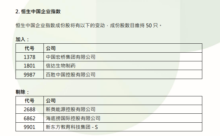 恒生中国企业指数方面,中国宏桥、信达生物、百胜中国将被纳入,纳入权重永别为1.30%、1.21%与0.91%;新奥动力、新东方-S等将被剔除,剔除前权重永别为0.49%、0.28%与0.24%。迂回后因素股数量保管50只不变。